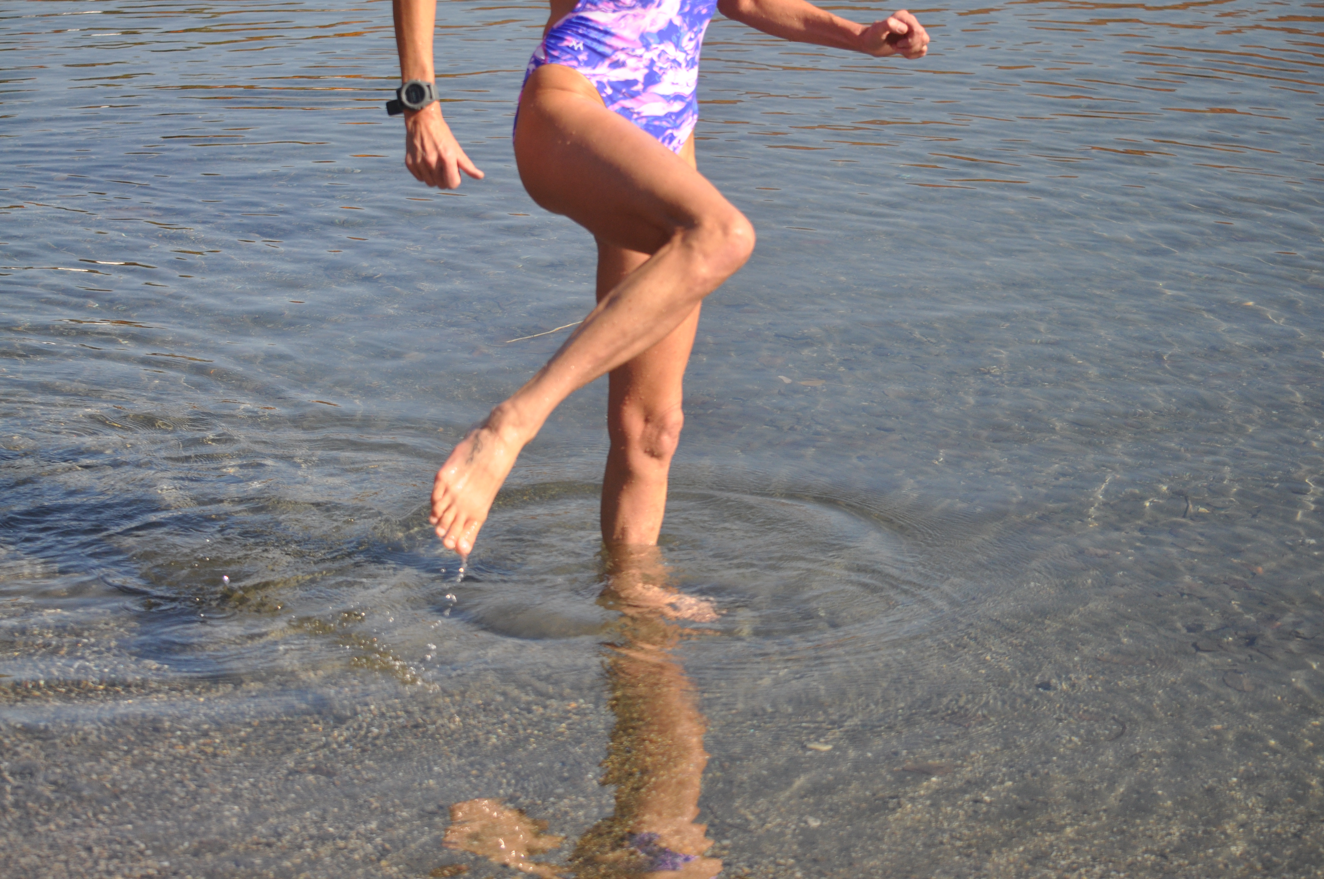 The start. In beach starts, swimmers line up behind the start line on land and run into the water and transition to swimming as quickly and efficiently as possible once the start horn sounds. These starts can be chaotic, both on land and in the water.